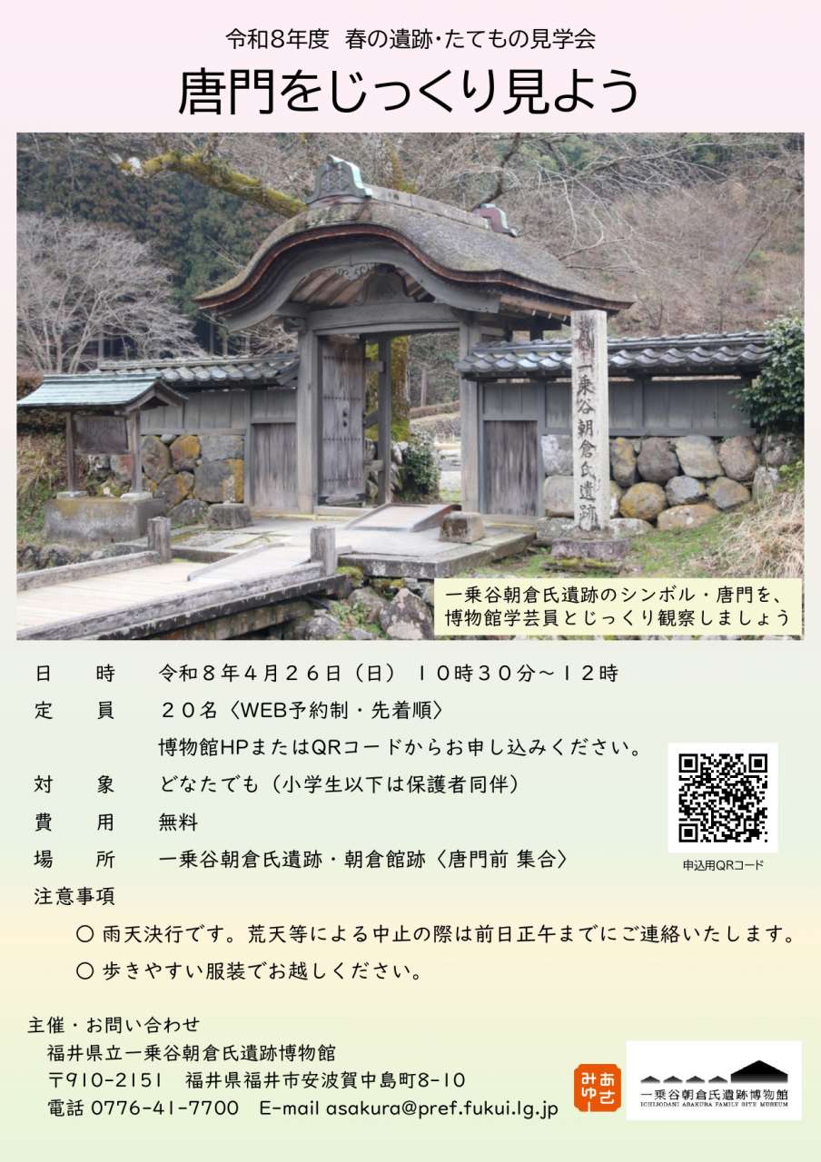 福井県立一乗谷朝倉氏遺跡博物館 電話番号:0776-41-7700 メールアドレス:asakura@pref.fukui.lg.jp |